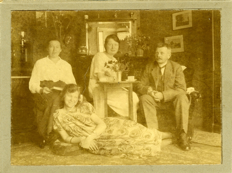 Zwartwit groepsportret van drie vrouwen en een man. De foto is in een huiskamer genomen. De foto is op karton geplakt.
