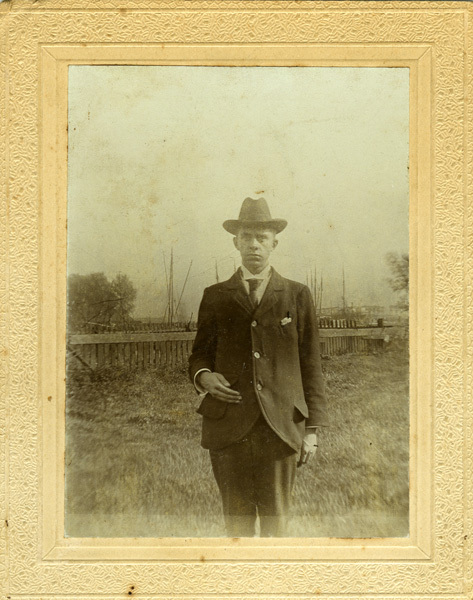 Zwartwit portret van een jonge man. Hij draagt een pak en een hoed. Op de achtergrond een haven. Foto is op wit karton geplakt met een bewerkte rand.