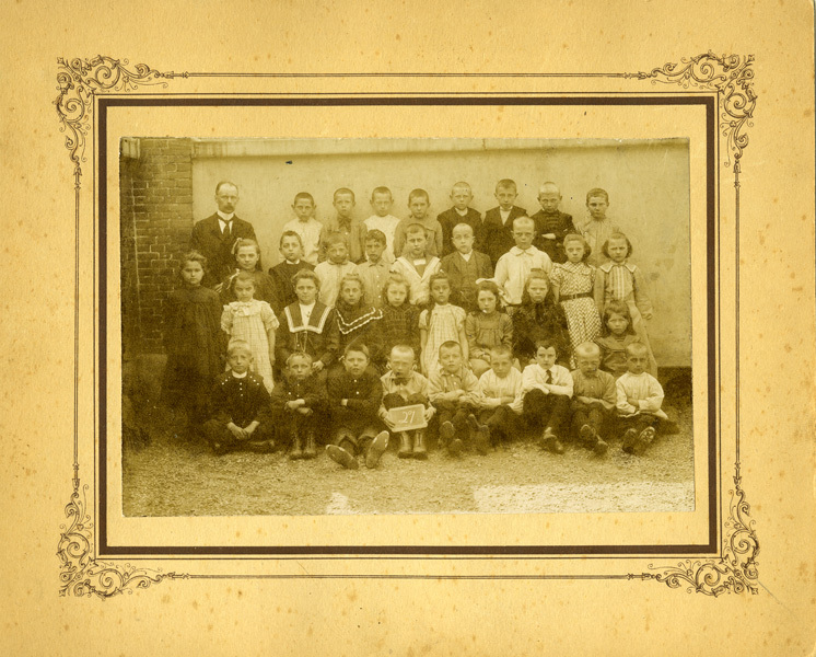 Schoolfoto van een klas van de openbare lagere school aan de Kuiperstraat in Brielle. Met onderwijzer Leenen.