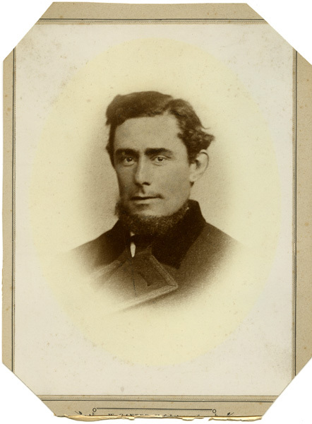 Portret van jonge man met donker haar, donkere ogen en een baard. Foto is op karton geplakt met afgeschuinde hoeken.