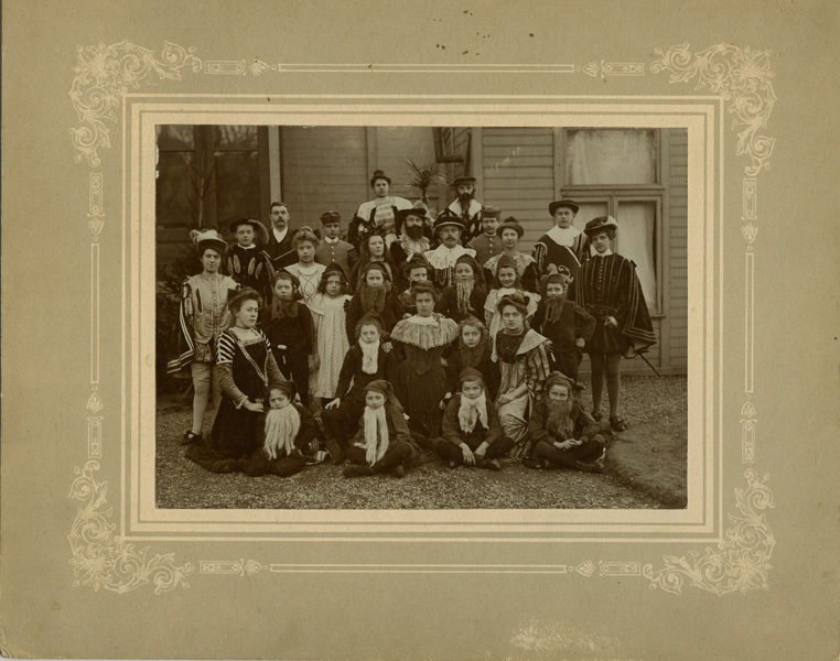 Groepsportret van groep jongeren. Een aantal zijn verkleed als kabouter, andere dragen jurken of korte broeken met een cape en een sabel met een hoed met een veer. De foto is geplakt op blauw karton met versieringen rondom.