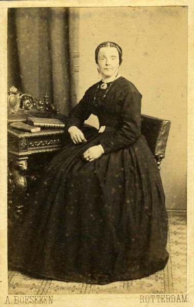 Portret van vrouw in zwarte jurk, gezeten aan een secretaire.