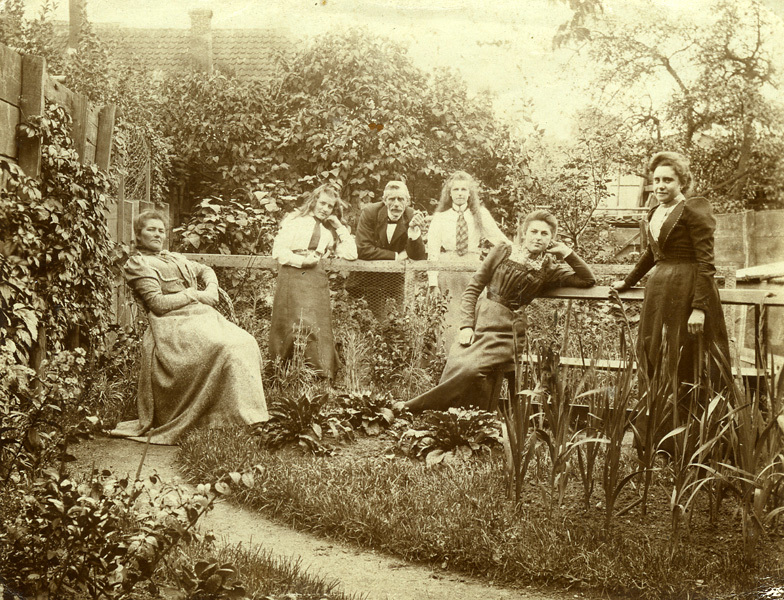 Groepsportret, genomen in een achtertuin, van vier vrouwen en een man. In zwartwit.