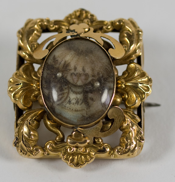Goudkleurige opengewerkte broche, met in het midden een ovale medaillon met een fijne pentekening met twee hartjes, twee pareltjes en de naam "Kiki".
