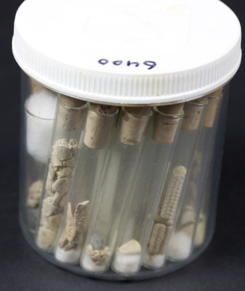 Doosje met daarin 1 klein reageerbuisje met schelpmateriaal en 29 smalle reageerbuisjes voorzien van krurkdop met daarin diverse schelpmateriaal. Geheel onbeschreven.