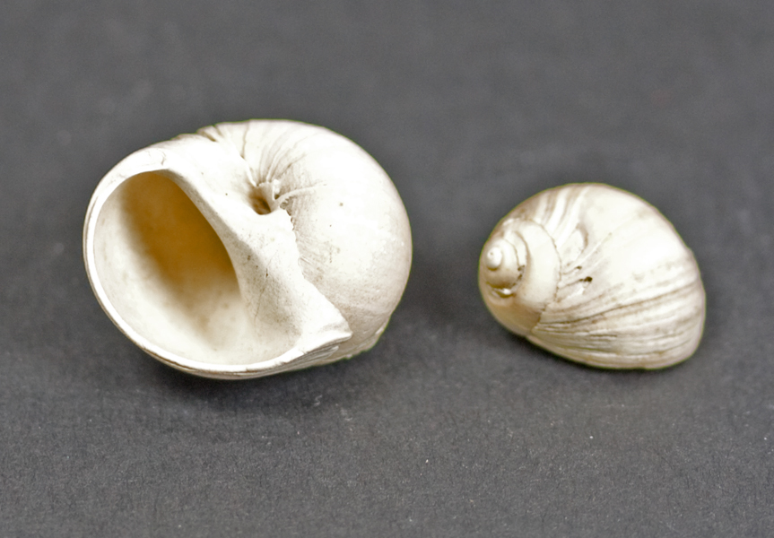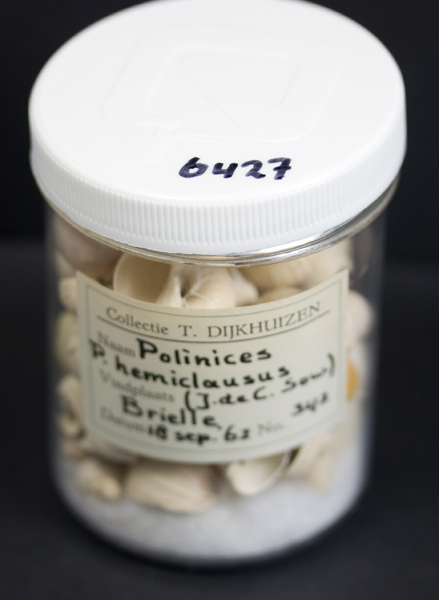 Polinices P. hemiclausus (J. de C. Sow) in een potje met los etiket, ca 40 stuks.