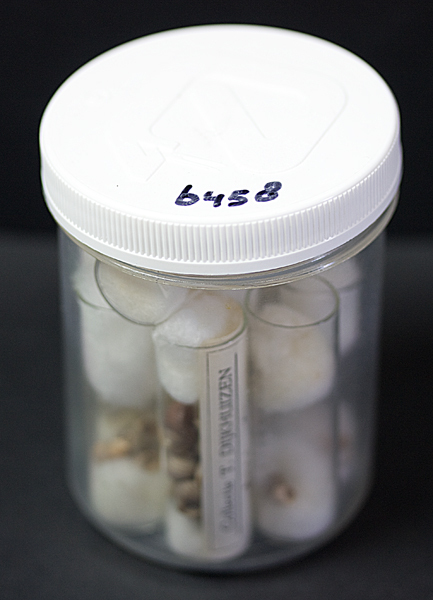 Potje met daarin negen reageerbuisjes met divers schelpmateriaal. Twee voorzien van etiket: Littorina saxatilis tenebrosa, Littorina L. saxatilis (Olivi).