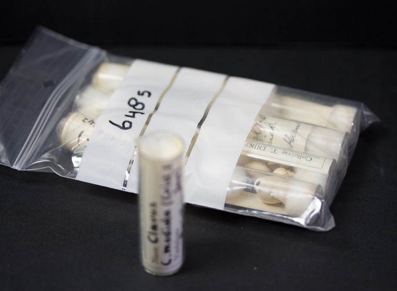 Zakje met daarin acht reageerbuisjes met divers schelpmateriaal voorzien van etiket: Clavus C. modiola (Crist. & Jan), Ditrupa subulata, Brocchinea B. mitraeformis (Brocchi), Eulima E. glabra (Da C.), Acteon tornatilis, Den Briel kalfabriek 7-8-'53, Admete A. viridula (Frabr.), Melampis pyramidalia.