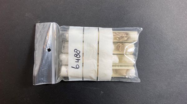 Zakje met daarin acht reageerbuisjes met divers schelpmateriaal voorzien van etiket Cerithiopsis tubercularis (mont), Emarginula reticulata J.Sow ,Calyptraea chinensis, Clavus belli Glibert,Digitaria digitaria, Phacoies decorata, Divaricella divaricata, Chlamys opercularis.