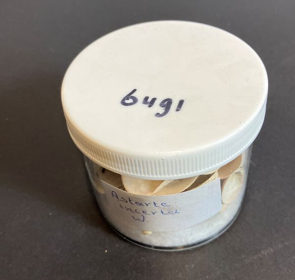 Plastic potje met etiket Astarte incerta W, bevattende cica 130 schelpen.