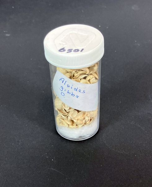 Plastic potje met etiket "Aloides gibba o", bevattende ruim 100 schelpjes.