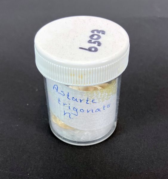 Plastic potje met etiket "Astarte trigonata n", bevattende 7 schelpen.