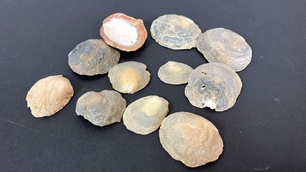 Plastic potje met etiket "Animoa striata", bevattende 11 schelpen.