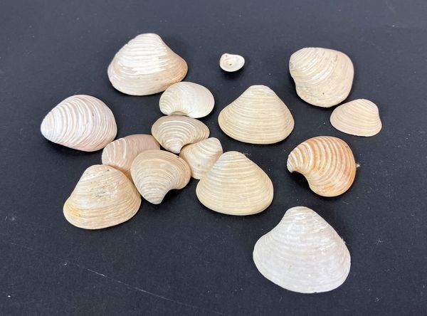 Plastic potje met etiket "Astarte Mutabilis S. Wood", bevattende 15 schelpen.