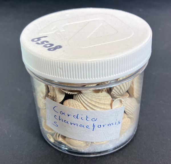 Plastic potje met etiket "Cardita Chamaeformis S", bevattende ca 200 schelpen.
