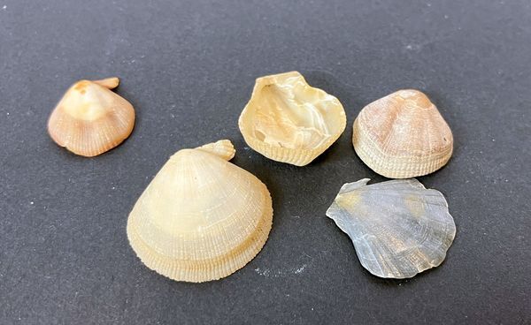 Plastic potje zonder etiket met vermoedelijk 5 "Chlamys " schelpen