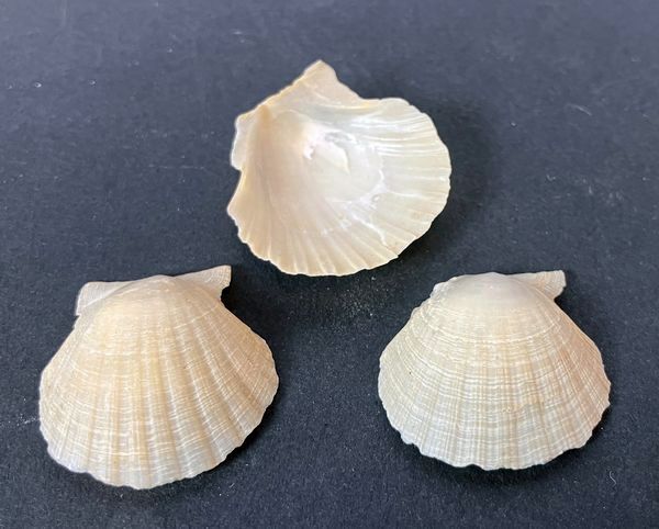 Plastic potje met etiket "Pecten" bevattende 3 schelpen.