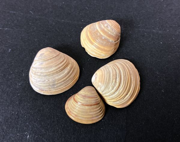 Plastic potje met etiket "Corbicula Fluminalis " bevattende 5 schelpen.