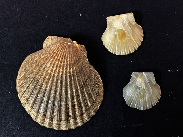 Plastic potje met etiket "Pecten maximus complanatus" bevattende 10 schelpen.
