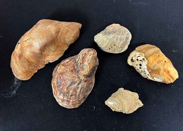 Plastic potje met etiket " Ostrea" bevattende 5 schelpen.