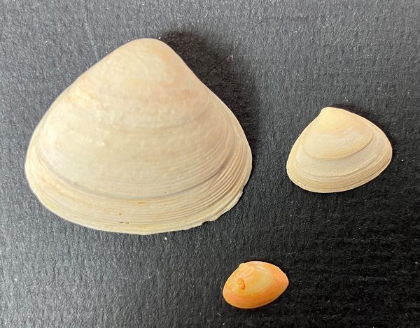 Plastic potje met etiket "Spisula subtruncata da C " bevattende 58 schelpen.