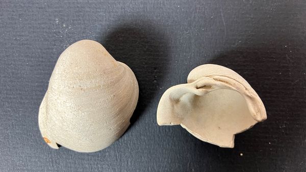 Plastic potje met etiket " Glossius Humanus L. " bevattende 2 schelpen.