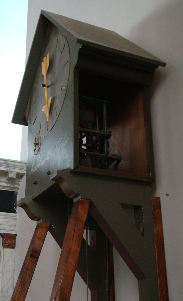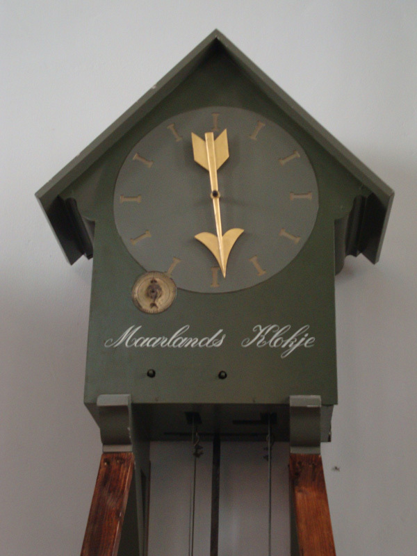 Uurwerk van Maarlands Klokje. In houten uurwerkkast, groen geschilderd met in witte letters het opschrift: Maarlands Klokje. Op houten onderstel. Met een goudkleurige wijzer.