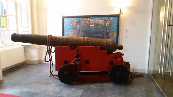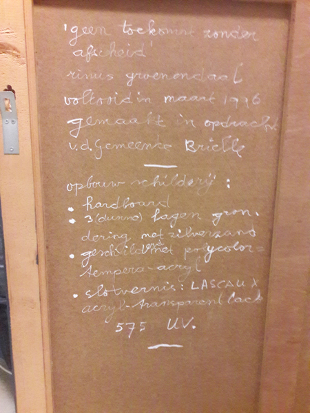 Schilderij, acryl op board, met alle aanzichten van de gevels op de Markt te Brielle. Op de voorgrond het grijze terras van de Markt, rechts de voorgevel van de hoofdwacht, links de voorgevel van het stadhuis met de twee winkels daarnaast. Rechts van het stadhuis cafetaria Schats 't Hoekje. Bovenaan de gevels van o.a. hotel ...