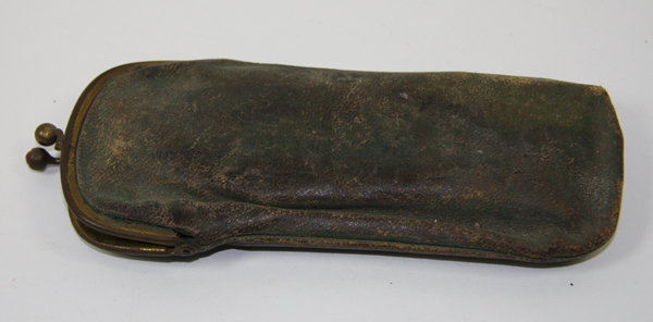 Bruinkleurige leren brillenkoker / etui. De zijkant is voorzien van een koperen knipsluiting.