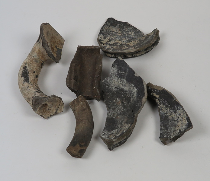 Scherven van grijsbakkend aardewerk, 6 stuks, gevonden in omgeving van burcht Oostvoorne.