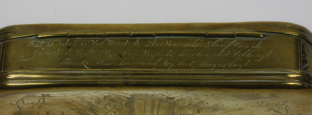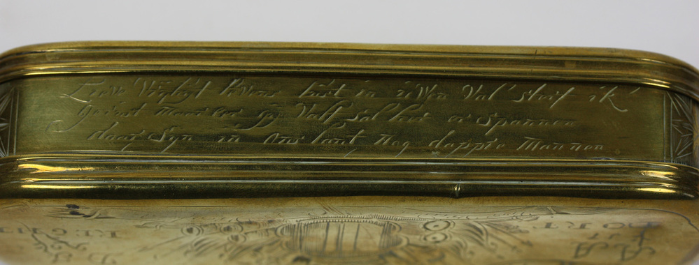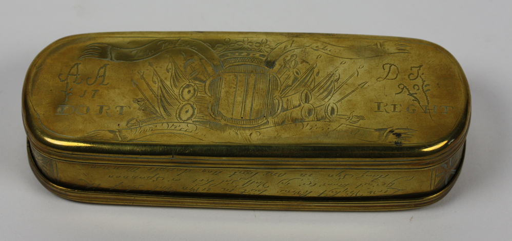 Tabaksdoos, geel verkoperd, met diverse inscripties en symbolen van de stad Dordrecht die naar de patriottentijd (1780-1787) verwijzen. Op deksel afbeelding van een stadsgezicht met diverse kerken, daavoor de Stedenmaagd van Dordrecht. Links- en rechts van de maagd diverse inscripties. Op onderkant het wapen van Dordrecht omgeven door banderollen met inscripties. Links- en rechts van ...