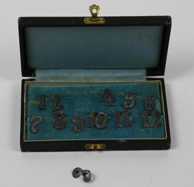 Zwarte doos, met koperkleurige sluiting, binnenkant blauw fluweel. In de doos zitten twaalf metalen cijferplaatjes waarmeer je drinkglazen kan markeren. Achter het cijfer zit een pin die op de bovenrand van een glas gezet kan worden.