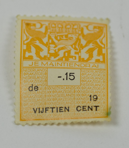 Belastingzegel of fiscaalzegel, 2x, van 15 cent. Zegel is oranjekleurig met bovenaan het rijkswapen van Nederland en daaronder opschrift 'JE MAINTIENDRAI'.