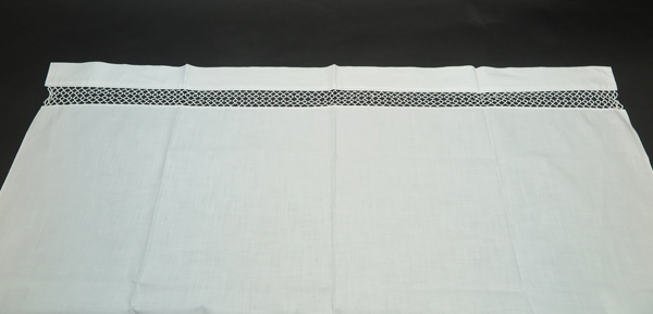 Laken, wit, aan bovenkant versierd met een opengewerkt rand met ruitpatroon.