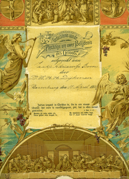 Getuigschrift voor Jaapje Adriaantje Boon (1906-02-25) ter herinnering aan haar belijdenis van geloof op 15 april 1927 in Rozenburg. Rondom getuigschrift diverse bijbelse voorstellingen waaronder: Christus aan het kruis, Christus spreekt de kinderen aan, Christus als herder, twee engelen en geheel onder het Laatste Avondmaal.