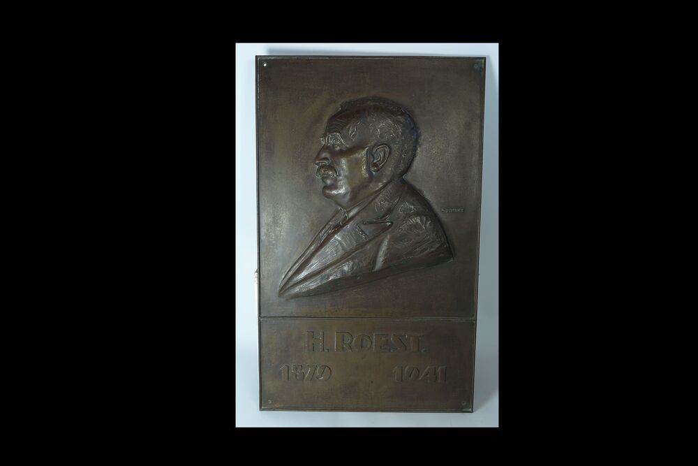 Bronzen plaquette met het portret van H. Roest met portret naar links. Onder portet opschrift: 'H. ROEST. / 1879 1941. H. Roest Gesigneerd rechts naast portret. In hoeken zitten gaten.