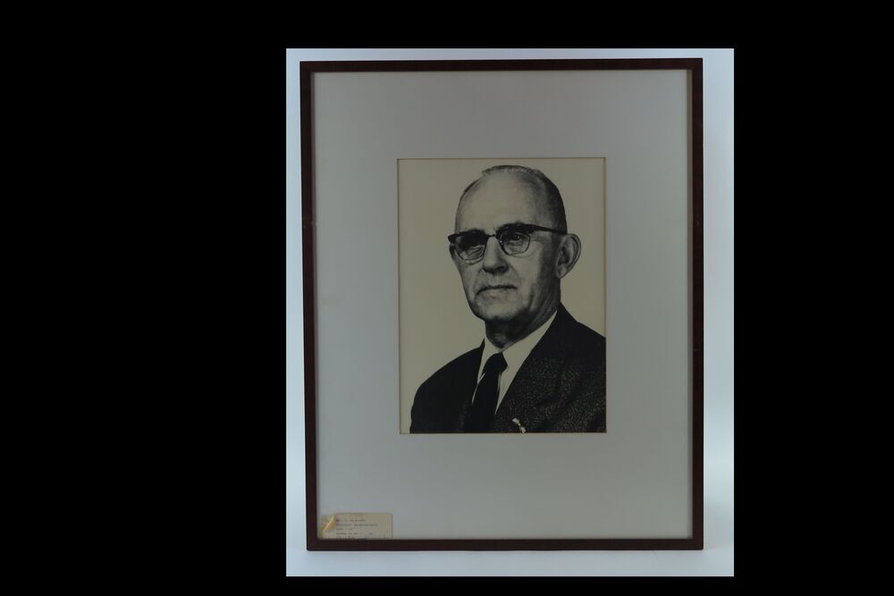Ingelijste foto met portret van C. de Snayer (voormalig directeur landbouwschool Brielle). Borstbeeld, lichaam naar links gedraaid. Man heeft kalend grijs haar en draagt een bril met zwarte bovenrand. Man draagt een nette jas, witte overhemd en stropdas. Op zijn linker revers draagt hij een lintje. Foto in wit passe-partout en smalle donkerbruine lijst.
