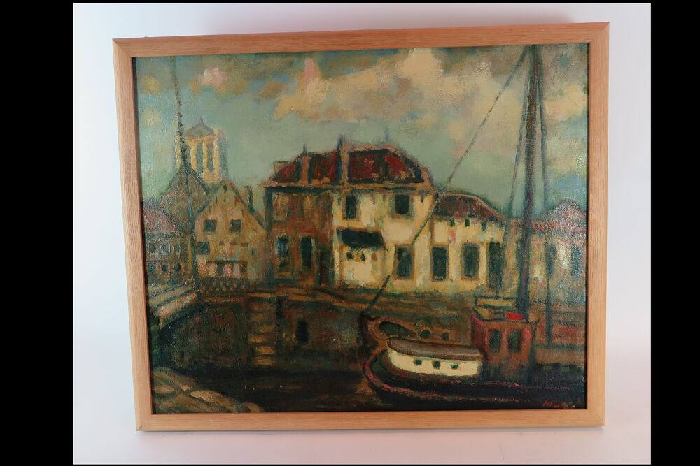 Schilderij, olieverf op linnen, met gezicht op Brielle vanaf de Kaaibrug op het Slagveld. Op de achtergrond links de toren van Catharijnekerk, daarvoor huizen aan de Turfkade en Lijnbaan. Op voorgrond rechts ligt een schip in de haven. Schilderij niet gesigneerd en zit in een diepe blank houten lijst.