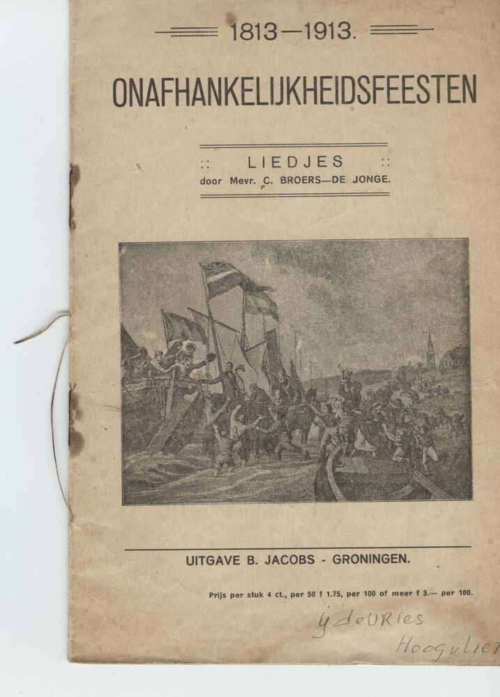 Boekje of gids getiteld: '1813-1913 ONAFHANKELIJKHEIDSFEESTEN Liedjes'. Op de voorkant een afbeedling (zwart/wit) met links schepen vlak voor een strand met juigende personen. De schepen voeren o.a. de Engelse en Spaanse vlag. Het boekje bestaat uit de volgende liederen op de volgende wijze: 1. 'Ik had een wapenbroeder'. 2. ''t Is plicht, dat iedre jongen'. ...