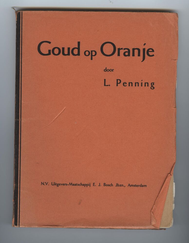 Boekje getiteld:'Goud op Oranje' door L. Penning. Boekje heeft een oranje kaft zonder afbeeldingen. In het boekje een korte levenschets van H.M. Koningin Wilhelmina (1880-1962). Inhoud boekje: 1. De kroning. 2. Vrede-conferentie en boerenoorlog. 3. een bruiloft. 4. De spoorwegstaking. 5. Het geschil met Venezuela. 6. Eene prinses geboren. 7. De wereldoorlog. 8. De watervloed ...