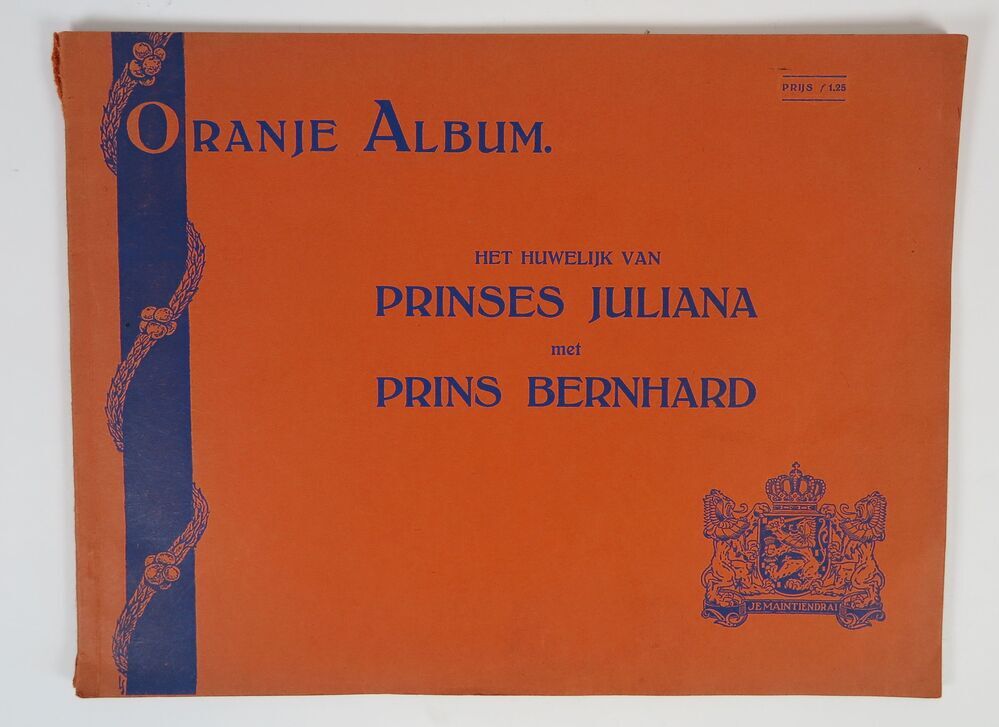 Boek getiteld: 'Oranje Album. Het huwelijk van prinses Juliana met prins Bernhard'. In het boek diverse zwart/wit foto's van prinses Juliana en prins Bernhard. Boek heeft een oranje kaft en is voorzien van blauwe letters.