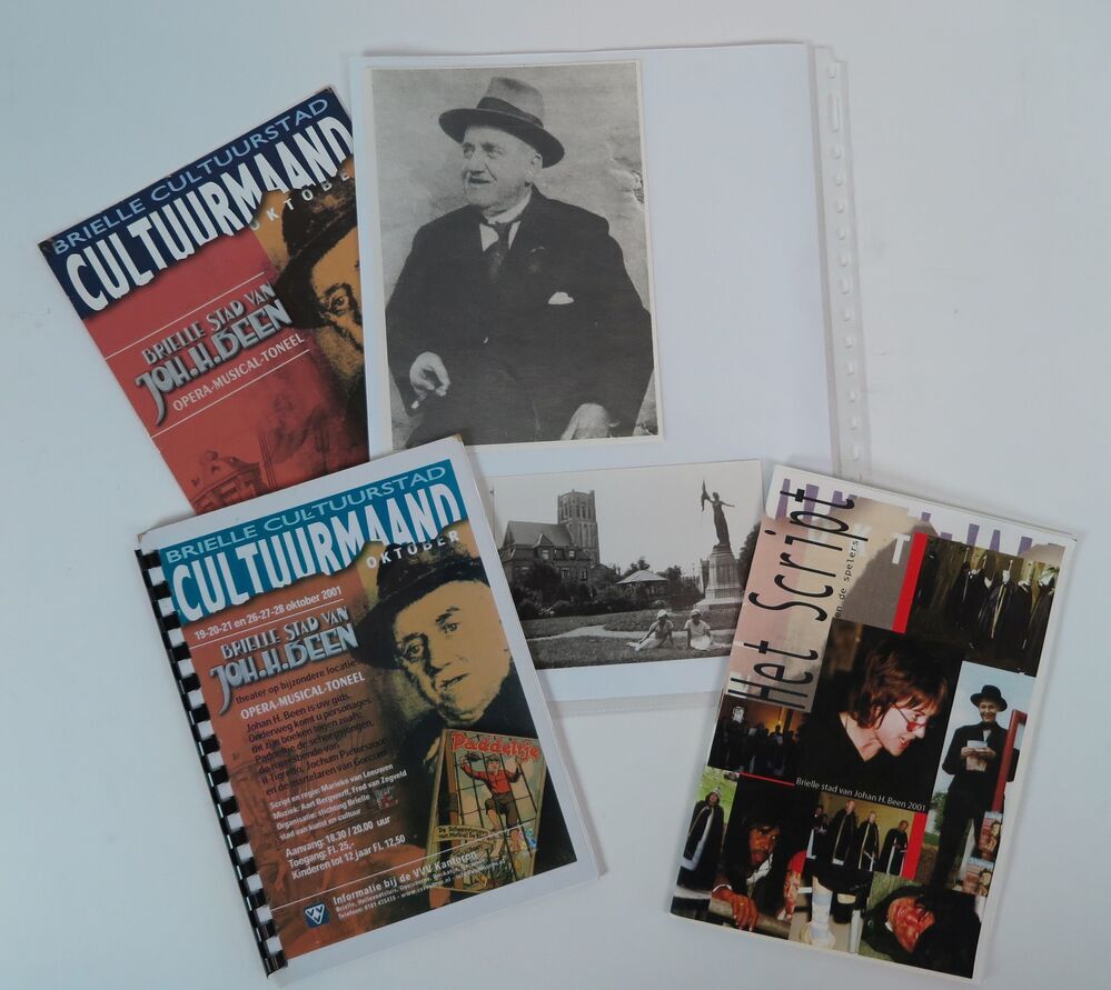 Zes documenten over Johan Been. 1. Script van toneelstuk 'Het Kind van Voorne' uitgevoerd in 1999. 2. fotohoes met twee foto's van Johan Been en één foto van twee dames nabij standbeeld 'De Nymph'. 3. 'Het script 'Brielle stad van Johan Been uit 2001. 4. 2x script 'Brielle stad van Joh. H. Been. met voorblad ...