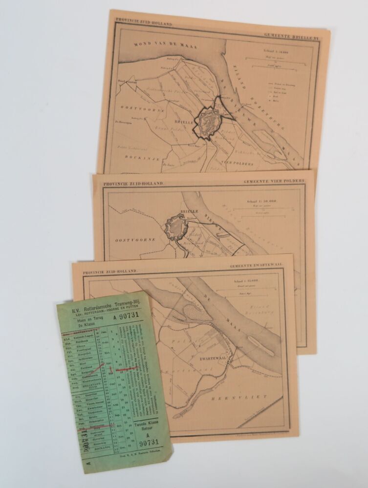 Kaarten, 16, bruin papier (reproducties) met de gemeenten: Zwartewaal, Vierpolders, Brielle, Spijkenisse, Zuidland, Abbebroek, Heenvliet, Geervliet, Hekelingen, Hellevoetsluis, Nieuw-Helvoet, Nieuwenhoorn, Oostvoorne, Oudenhoorn, Rockanje, en Rozenburg. Verder een groene tramkaat van N.V. Rotterdamsche Tramweg-Mij.