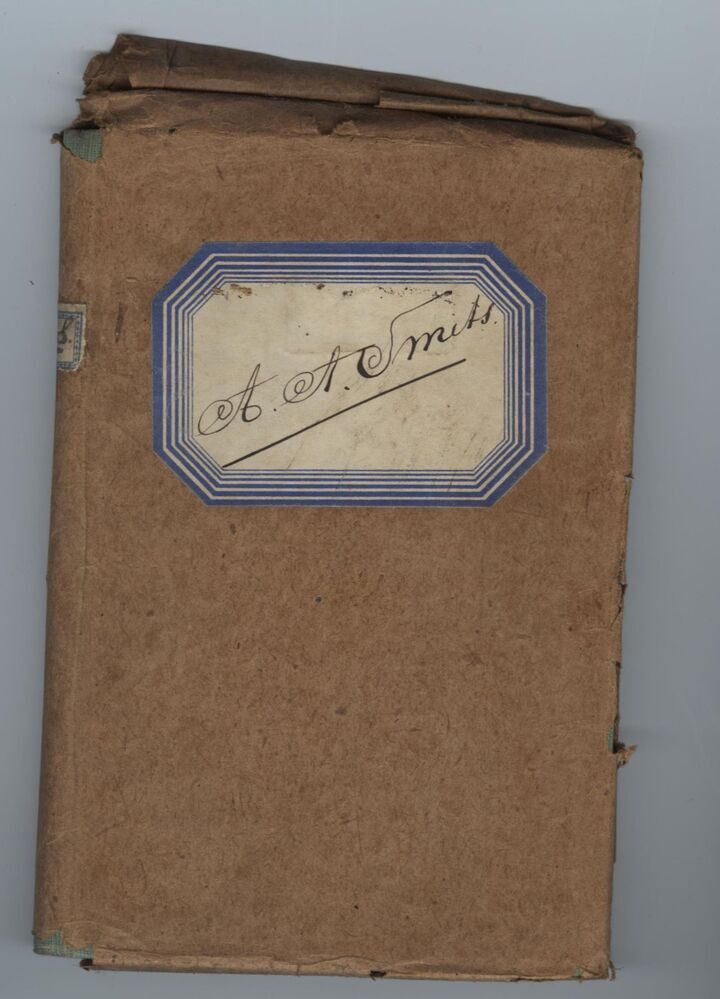 Boek, voorzien van extra bruine kaft, getiteld: 'Le Tour Du Monde en Quatre-Vingts jours' door Jules Verne. Vertaald in Nederlands: 'Reis om de wereld in tachtig dagen'. Bruine voorkaft voorzien van etiket met opschrift: 'A.A. Smits'. Boek heeft zelf een groene kaft.