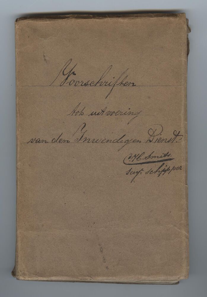 Boek, voorzien van extra bruine kaft (boek zelf heeft zwarte kaft) getiteld: 'Voorschriften tot uitvoering van den Inwendigen Dienst'. Aan binnenkant kaft eveneens een handgeschreven titel: 'Handboek voor den Torpedodienst Tweede deel Hoofdstuk VII t/m XVII. Op titelblad: 'Reglementen en Voorschriften betreffende de oefeningen, werkzaamheden en den inwendigen dienst bij het Korps Torpedisten te Brielle ...