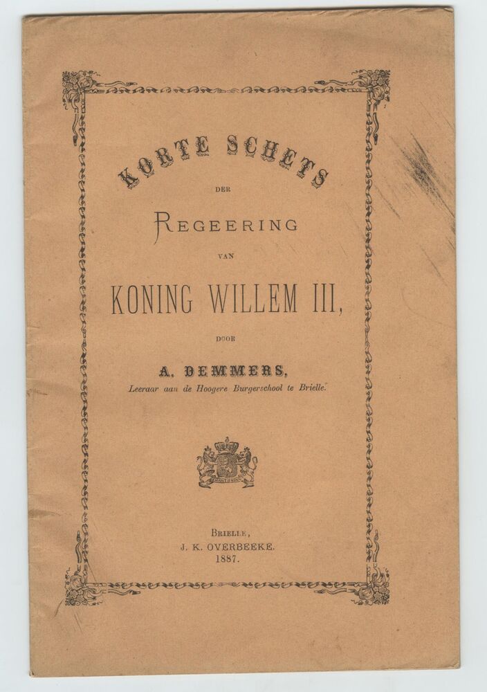 Boek, dun, met lichtbruine kaft getiteld: 'Korte schets der Regeering van Koning Willem III door A. Demmers (Leraard aan de Hoogere Burgerschool te Brielle).