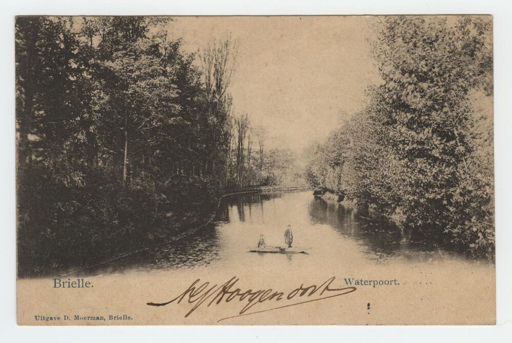 Ansichtkaart, zwart/wit, met opschrift: 'Brielle. Waterpoort'. Aan de zijkanten bossages op de voorgrond in het midden twee personen in een bootje op het water. Achterkant beschreven en voorzien van postzegel van 1 cent.