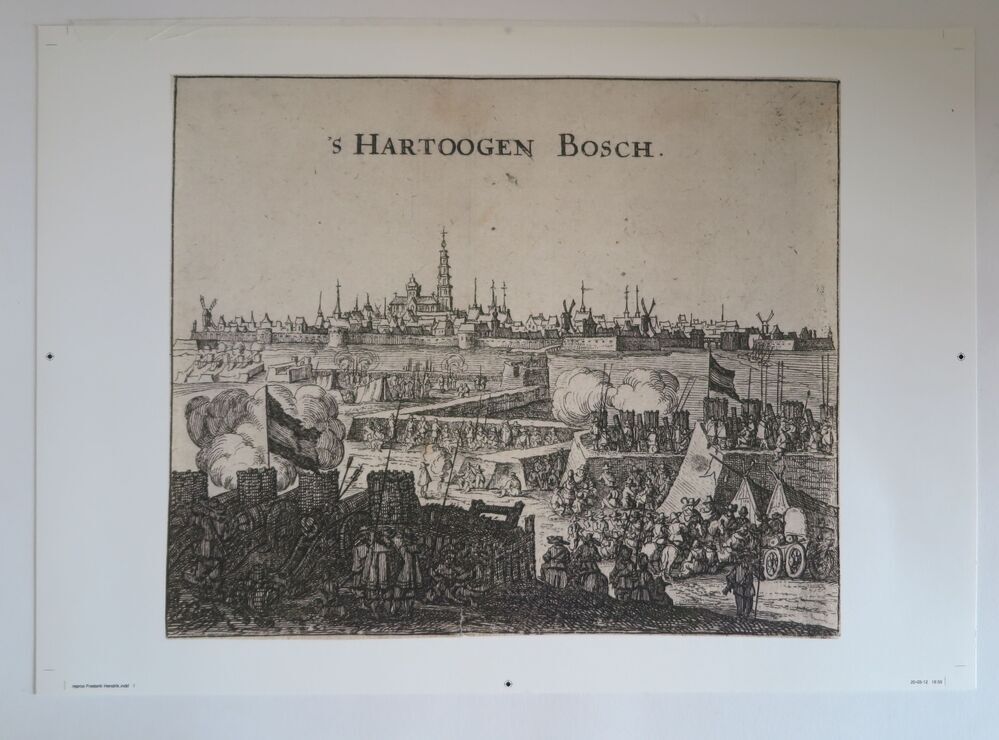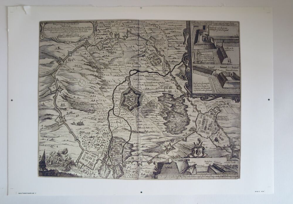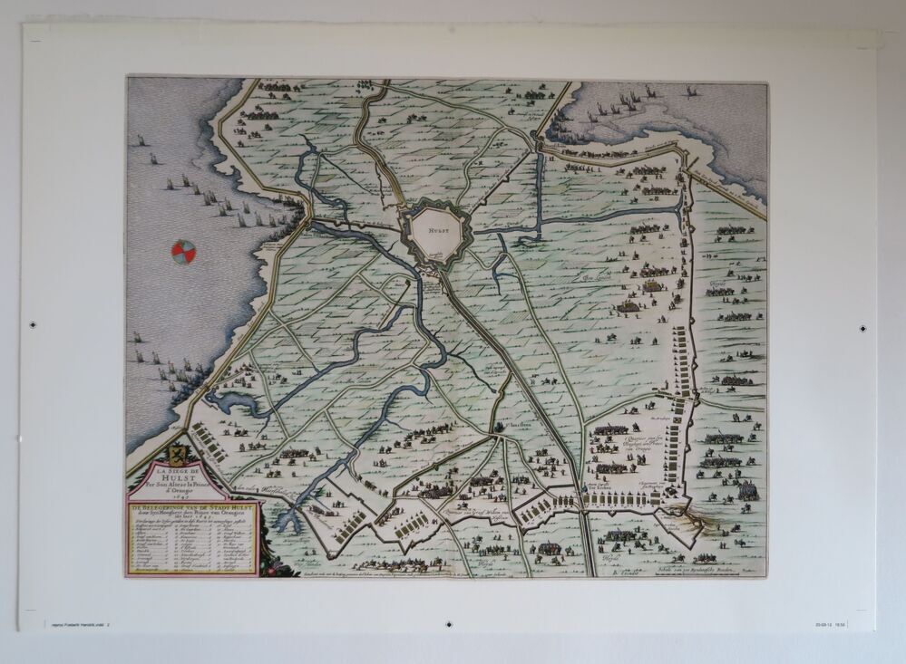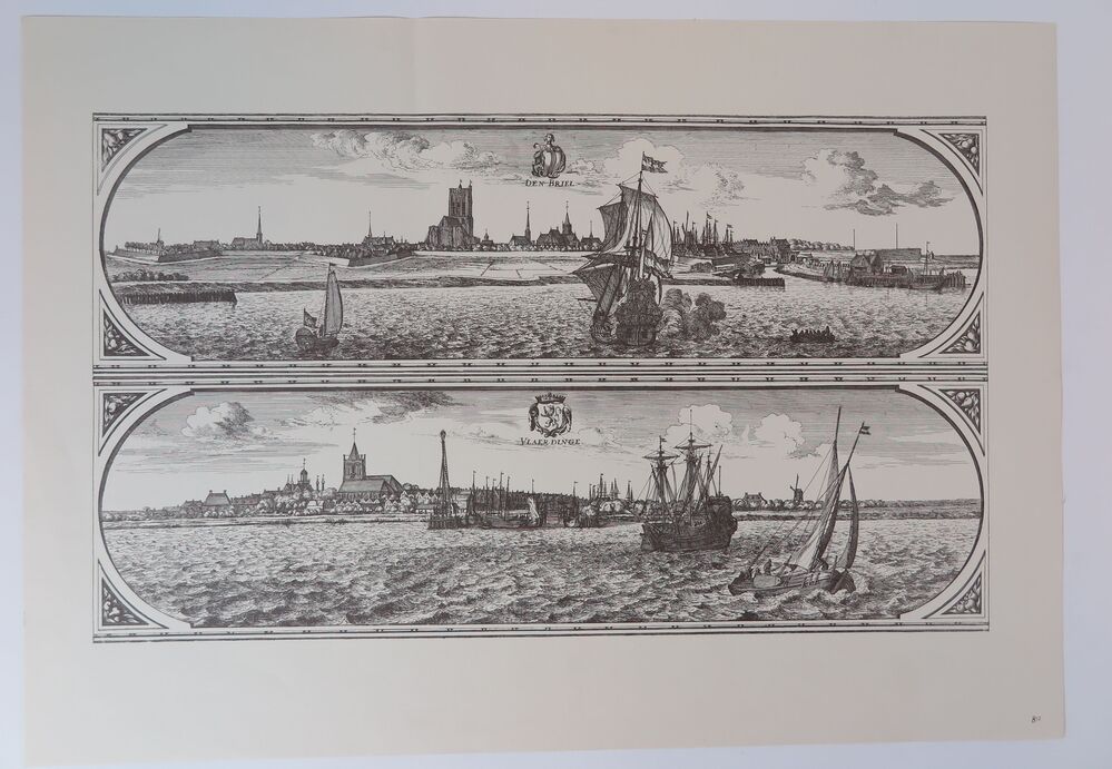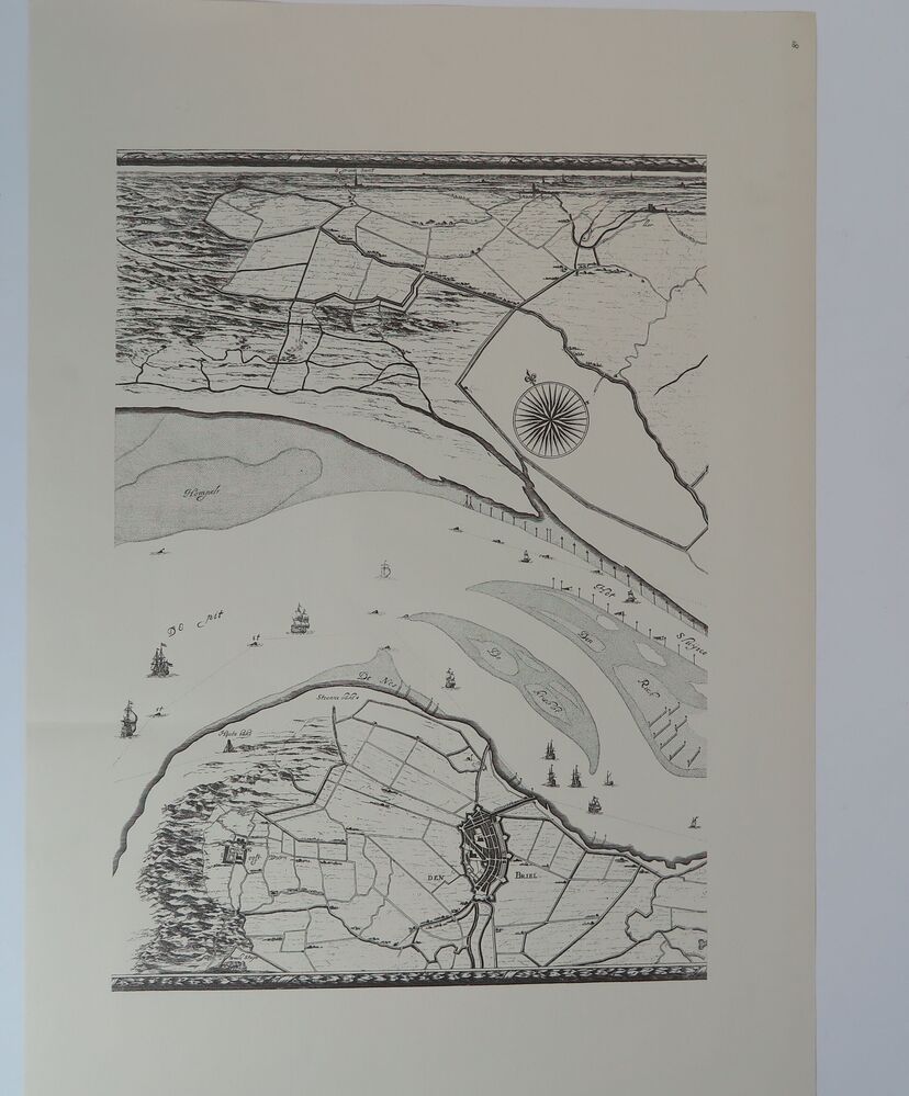 Set reproducties bestaande uit: aquarel van M. Middelhoek met 't Heultje te Brielle, fotoimpressie van slag op Markt (Franse tijd 1813) [foto Streekachief VPR], prent van kaart met daarop Voorne en deel Noordzee, kaart of zeekaart van de Noordzee met De Wstplaet en Hoek van Holland, prent met gezicht op stad Den Briel en daaronder ...