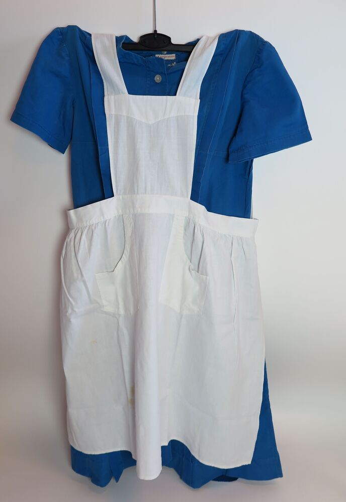 Uniform, katoen, van de voormalige Vakschool voor meisjes te Brielle, gedragen door Aafke Groenewegen. Uniform bestaat uit een blauw jurk /uniform met daarover een witte schort.