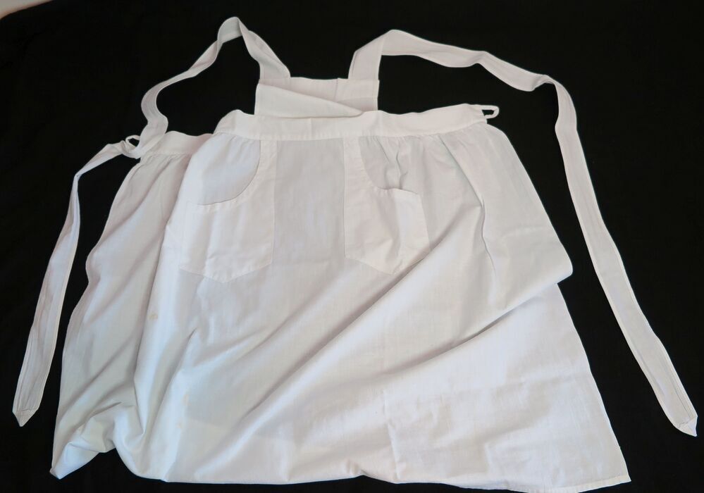 Wit katoenen schort behorende bij uniform van de voormalige Vakschool voor meisjes te Brielle. Aan de voorkant heeft de schort twee zakken. Schort is gedragen door Aafke Groenewegen.